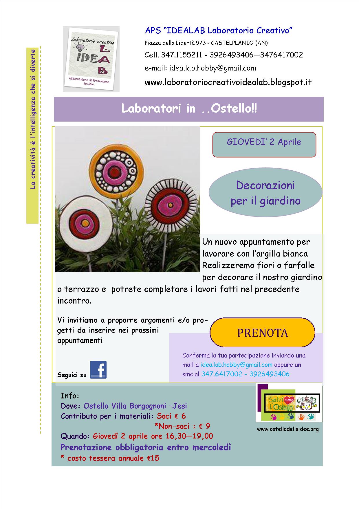 Nell’ormai consueto appuntamento con laboratori del giovedì curati dall’associazione APS Idealab laboratorio creativo, utilizziamo l’argilla bianca per realizzare dei fiori o farfalle che serviranno a decorare il nostro giardino o terrazzo. Si potranno completare gli oggetti modellati durante il precedente incontro.