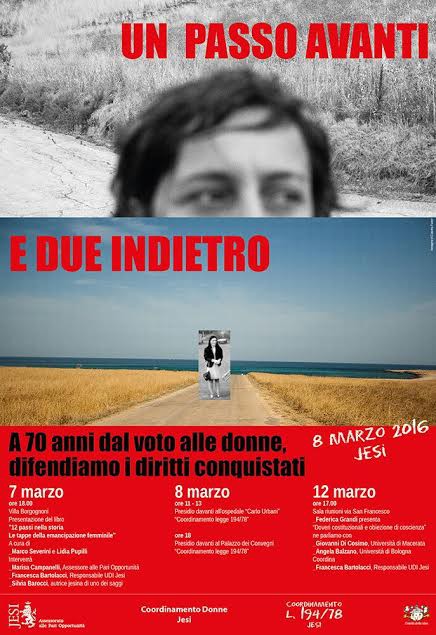 Presentazione del libro “Dodici passi nella storia , le tappe dell’emancipazione femminile” a cura di Marco Severini e Lidia Pupilli. A settanta anni dal voto alle donne, ripercorriamo le tappe delle conquiste femminili e ci interroghiamo sui diritti da conquistare e su quelli da difendere. Partecipano gli autori, Marco Severini, Lidia Pupilli, e Silvia Barocci. Intervengono:Marisa Campanelli ,Assessore alle pari opportunità del Comune di Jesi e Francesca Bartolacci ,Presidente U.D.I. Jesi.